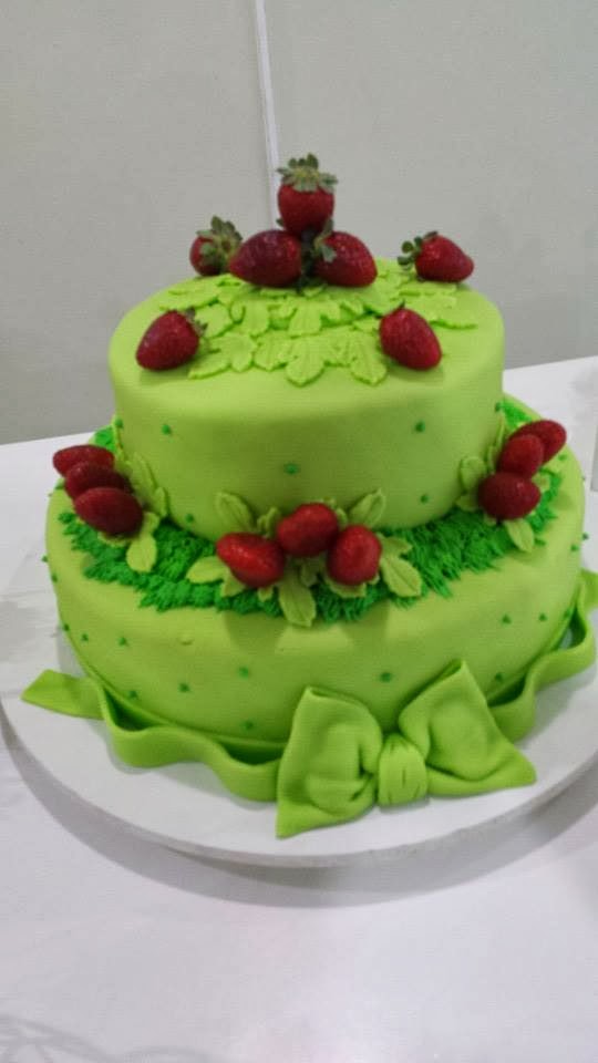 Bolo com massa de baunilha, recheio de Creme de Nozes com Baba de Moça e decorado com Morangos Frescos.